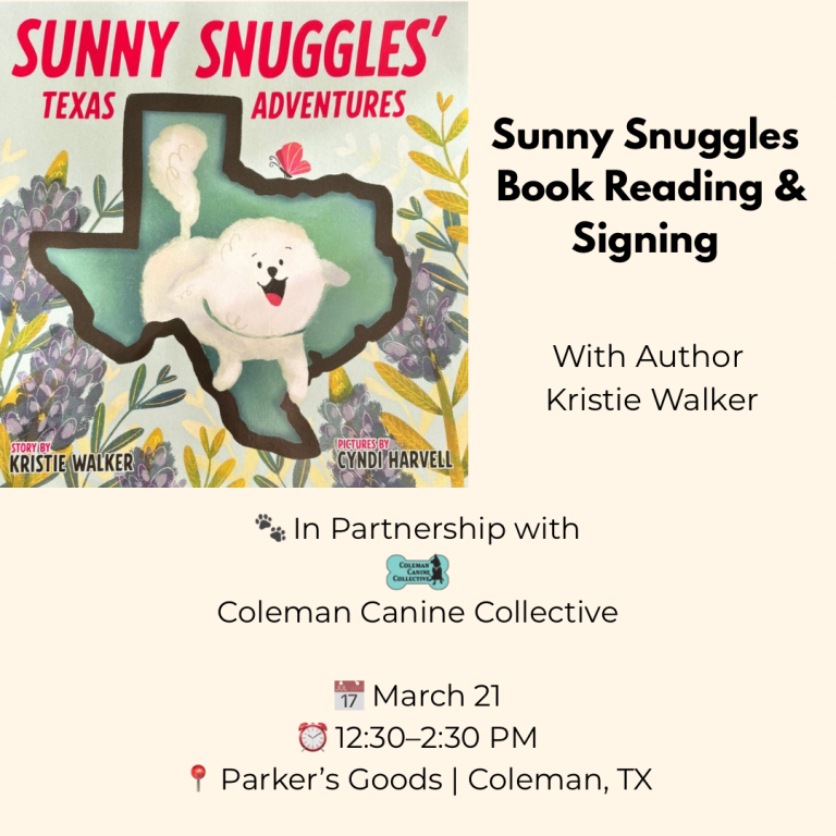 Collaboration with Author Kristie Walker and Coleman Canine Collective. Saturday Mar 21st from 12:30-2:30. Ms. Walker will be reading her book Sunny Snuggles and a book signing, we will also have animals available for adoption and collect donations for the rescue.